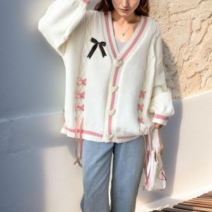 Women’s Cute Sweet Cardigan Sweater Kawaii Love Button Long Sleeve V-Neck Bowknot Knitted Outerwear