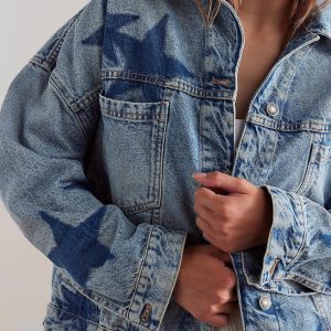 Women Casual Denim Jacket d Leopard Stars Printed Boyfriend Vintage Jean Jacket Coat with Pockets
