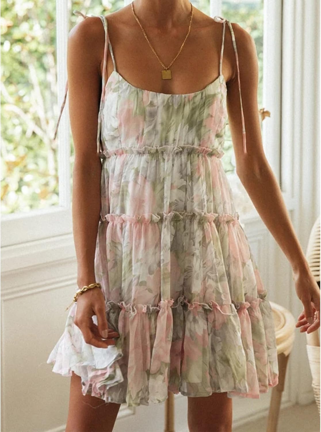 - Features—The floral mini dress d with tiered ruffle detailing, spaghetti strap, sleeveless, pleated, flowy dress, summer beach dress, mini short dress, very exquisite to show a feminine charm, pretty adroable.